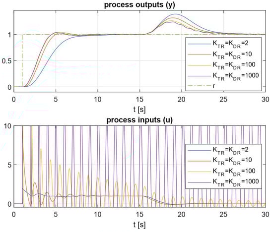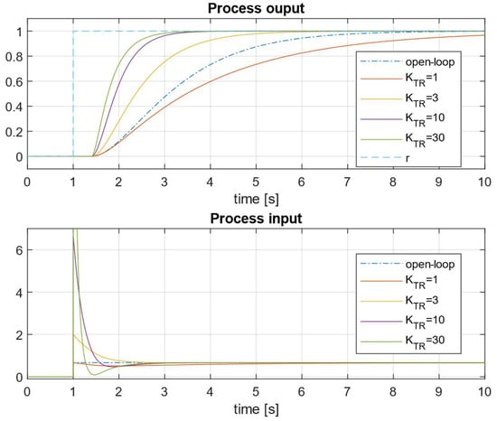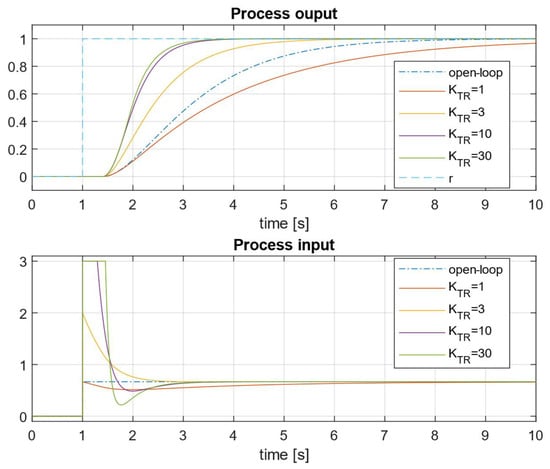 Let us now test the block diagram in Figure 4 using the same process model (13) as in the previous example. The parameters KPR = 1.5 and, according to Equation (8), tar = 2.4. The closed-loop responses were tested with different gains KTR in the range between KTR = 1 and KTR = 30. The closed-loop responses for the unlimited control signals are shown in Figure 5. It can be seen that the closed-loop speed increases with increasing KTR, while the improvements are not so obvious at higher KTR values. The vertical axis of the process input is limited to show the signals more clearly (the maximum value of the process input signal with KTR = 30 is 20). The open loop response to the scaled step input is represented by the dash-dotted line and the reference by the dashed line. All closed-loop responses are smooth with no visible overshoots for any KTR. The stability also does not appear to be degraded by an increased gain KTR.