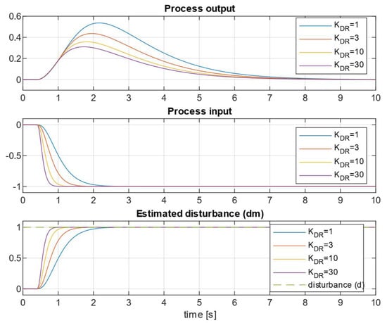 It can be seen that the disturbance-rejection performance increases with increasing gain KDR. However, the disturbance rejection performance does not increase proportionally to the desired noise gain KDR. The disturbance rejection performance at KDR = 30 is only slightly better than at KDR = 10, while the noise level increases by a factor of 3. On the other hand, all responses are smooth and stable. This is to be expected, because if the model transfer function corresponds to the process, the signal dm is only a filtered and delayed disturbance signal d.