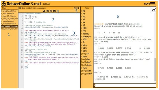 The areas Ak and the model parameters, according to Equations (34), (35) or (36), for a given time delay Tdelaym, can be calculated using Matlab/Octave scripts available on the Octave Bucket website []. When you click on the link [], the OctaveOnline window appears, as shown in Figure 10. The areas and the model parameters are calculated as follows: