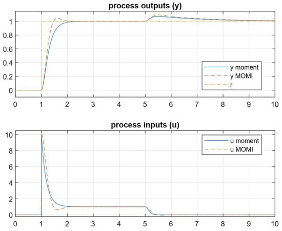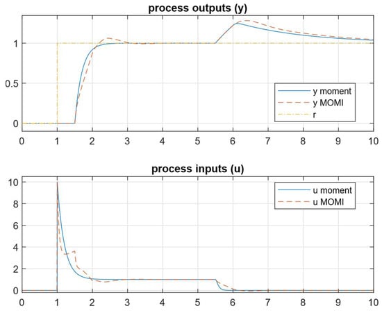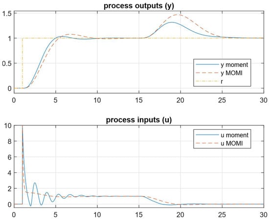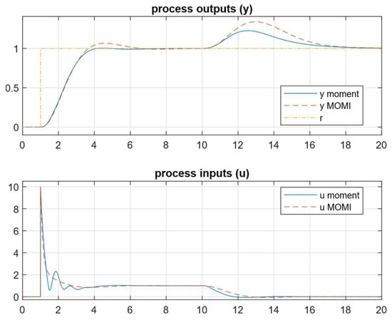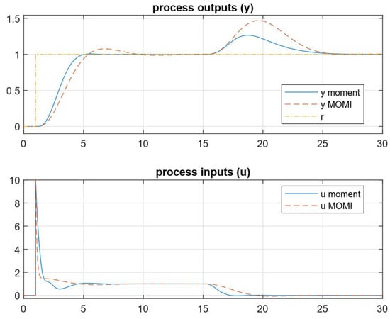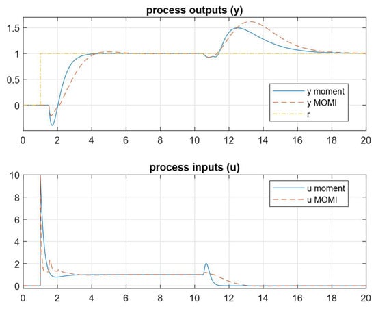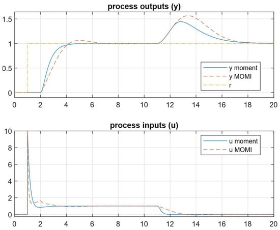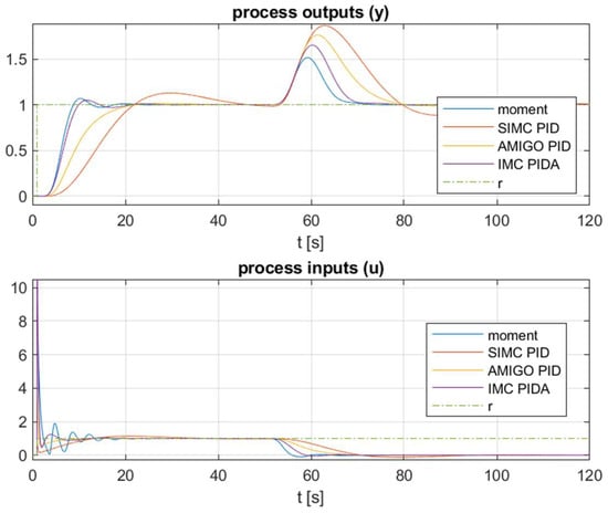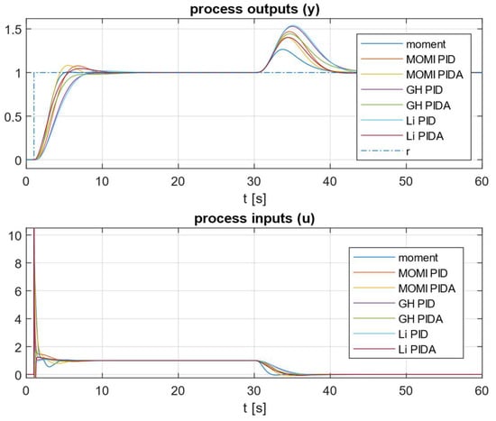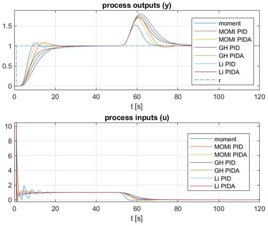 The IAE and ISE values for the process GP7(s) are shown in Table 2. The proposed method gives the lowest IAE and ISE values, except for the ISEr value, where the Li PIDA method gives a slightly lower value. The lower value is mainly due to the 10-times larger controller “kick” during the reference change, compared to the proposed method. This “kick” increases the initial speed of the closed-loop control, but later causes larger overshoots and longer settling times of the process. Visual comparison of the closed-loop responses (Figure 22) shows that only the MOMI PIDA method provides a comparable speed of tracking response. However, the proposed (Moment) method has virtually no overshoot and its disturbance rejection performance is much better than all other methods.