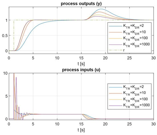 The results show that all closed-loop process output responses are stable and smooth. There is almost no difference in tracking responses at gains KTR = 100 and KTR = 1000, while there are some small differences in disturbance rejection responses at gains KDR = 100 and KDR = 1000. Of course, due to the noisy measurements, such high values of KDR usually cannot be applied in practice (note that KDR represents the amplification of the measurement noise).