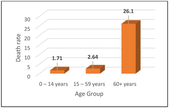 As shown in the figure, the death rate for the 0–14 years age group is 1.71 meaning that there would be 1–2 deaths among 1000 individuals under 15 years old. The death rate for the second group (15–59) is 2.64, which indicates 2–3 would die in the range of productive ages. Lastly, the death rate for people aged 60 or more rises around 10 times to 26.1 compared to the prior age groups, which shows that the mortality of elderly people is 26–27 among 1000 individuals.