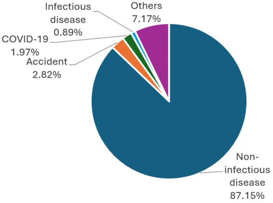 In addition to the age-specific death rate, it is interesting to investigate the cause of the death obtained from a similar census. According to Figure 2, non-infectious disease is the major cause of death in Indonesia, which is 87.15%. The second cause is accident, which is a quite small percentage (2.82%). Infectious disease is the rarest cause of mortality with a percentage of only 0.89%.