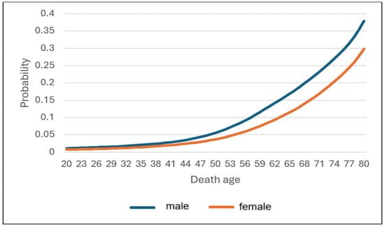 Figure 3 illustrates the probability of death across the ages 20 to 80, with separate lines representing the mortality risks for males (blue line) and females (orange line). The data reveal several key patterns that reflect the differences in life expectancy and mortality rates between genders over this age range. Both the male and female probability-of-death lines exhibit a gradual increase with age, indicating that the risk of death rises as individuals get older. However, the overall probability of death for males is consistently higher than that for females across all age intervals. This aligns with general population trends where men, on average, have shorter life expectancies than women.