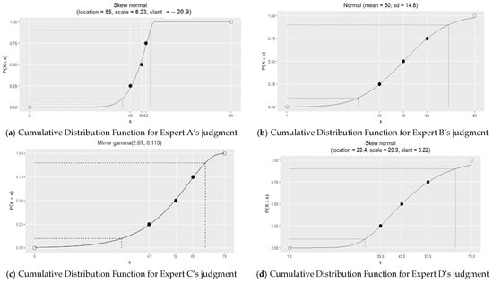 In this case, are 25%, 50%, and 75%, respectively. Next, the cumulative distribution function of each quantile will form a full CDF of . We can also derive the probability distribution function (pdf) for and estimate the parameter distribution. Let us suppose that the expert distribution has a parameter , then the CDF for the first value, second value, and third value provided by the expert is , , respectively. The function of combining the three CDFs is as follows: