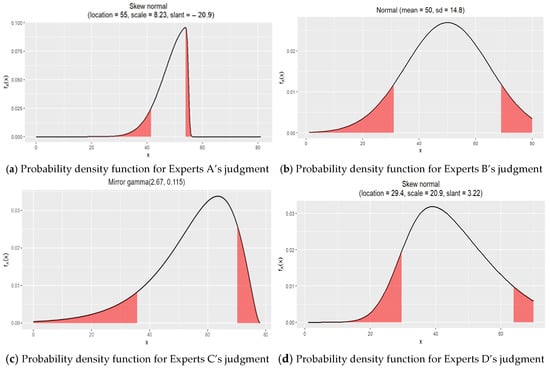 Figure 5 describes the probability density function of the average age of the policy owner when making an insurance claim for four different experts. According to Figure 5, the distribution fitted for the judgment given by Expert A is a skew normal distribution with a mode of 55 years old. This means that the majority of policy owners in company A will make claims at the age of 55 years old. The 95% confidence interval of the distribution is [42, 55], which implies that the policy owner will make a claim in the interval between 42 and 55 years old. In addition, it is unlikely that the policy owner will make a claim before 25 years old or after 60 years old.