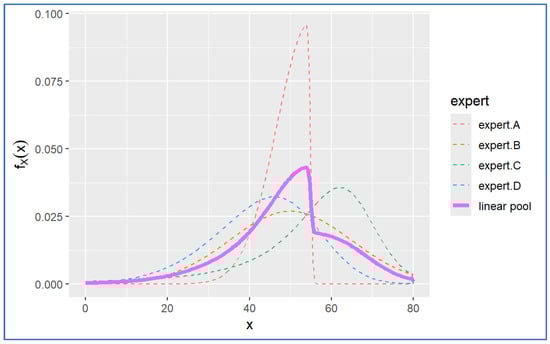 Linear pooling is a method used to aggregate expert judgment in the form of statistical probability distributions onto a consensus probability distribution. A foundational critique and overview of various methods for combining probability distributions, including linear pooling can be found in []. Linear pooling involves the weighted average of the probability density functions (PDFs) constructed from expert opinions. In addition, linear pooling is still superior in comparison with other methods in terms of its practical use []. Weighted pooling, on the other hand, can work better, but an extra step in expert testing is required. The idea of pooling is to combine these individual distributions that reflect the collective judgment. The method assumes that each expert’s judgment represents a valid piece of information.