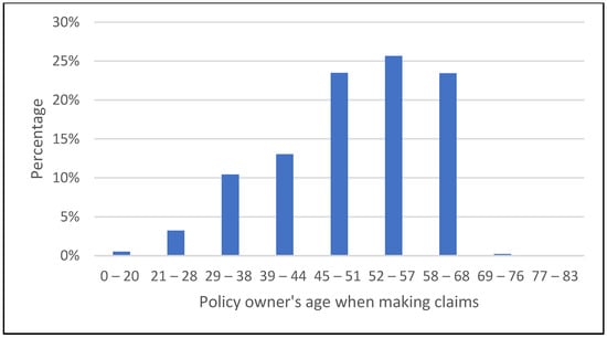 The expert judgment distribution is subsequently compared with the currently available life insurance claim data to validate against the actual conditions. An analysis based on the claim data reveals that the majority of claims are made when the policy owner’s age ranges from 52 to 57 years, as shown in Figure 7. The actual data support the expert judgment distribution where most policy owners are believed to make claims at the age of 54 years old.