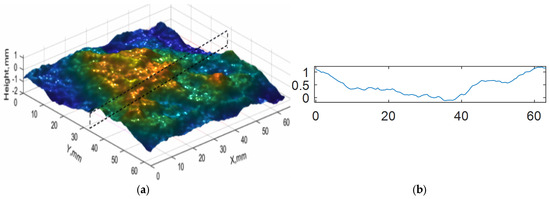 The results of the calculations reveal a strong positive correlation between the two-dimensional and three-dimensional parameters, as demonstrated in [27]. Consequently, the parameters D and Rq in the two-dimensional space can be extended to the three-dimensional space for estimation. This process involves determining D and Rq for the two-dimensional joint morphology and estimating the corresponding D3 and R3 values. A random three-dimensional joint surface is then constructed using the inverse Fourier transform, with the middle section’s profile extracted for morphological analysis, as shown in Figure 3a. If the quantitative parameter error between the reconstructed joint morphology and the preset morphology meets the specified criteria, the joint contour with the desired morphological features is output, as illustrated in Figure 3b.