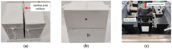 Initially, a mold featuring the joint surface was fabricated using 3D printing (as shown in Figure 4a). Gypsum was then poured into the mold to form a cast, resulting in a sample with complete upper and lower occlusion upon demolding (see Figure 4b). Finally, the direct shear test was performed, as illustrated in Figure 4c.