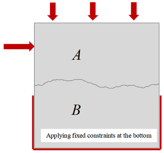 The numerical model consists of a 150 × 150 × 150 mm square rock sample, where a global cohesive element insertion method is utilized to capture changes in contact during the simulation process. The contact settings are as follows: normal hard contact, tangential frictional contact, and triangular mesh discretization. The Mohr–Coulomb yield criterion is applied, and the simulation is solved explicitly. Boundary conditions are illustrated in Figure 5, with the bottom unit nodes fixed and a uniform load applied to the top surface, while a constant lateral displacement is imposed to simulate the shearing process. The specific parameters of the model are provided in Table 2.