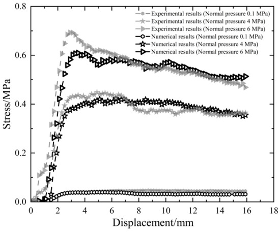The direct shear test was performed with fixed constraints applied to the lower half of the rock model, while normal pressure was exerted on the top. Subsequently, transverse shear was applied to the upper half of the rock model. Detailed experimental conditions are provided in Table 1, and the corresponding results of the direct shear test are presented in Figure 5.