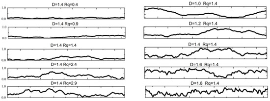 Building on the validated numerical model, a further numerical model for fractured rocks was developed, incorporating joints with various morphological characteristics. Since the fractal dimension D and frequency-domain amplitude integral Rq quantitatively represent joint morphology across different scales, this study applied the aforementioned joint generation method to create 30 sets of joint profiles with varying morphological features. The specific combinations and joint profiles, with different parameters, are presented in Table 3 and illustrated in Figure 7. Considering the significant influence of the friction coefficient between the upper and lower interfaces of the joint on shear stress, three different friction coefficients were used in the calculations to examine the impact of interface friction properties on the resulting shear stress.