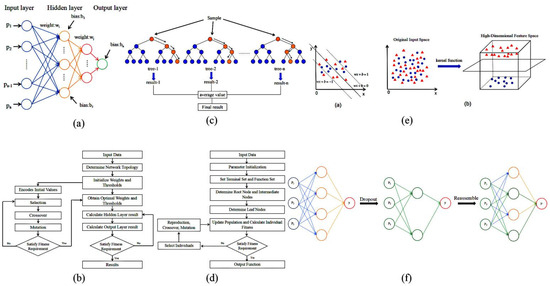 In this context, ω represents the n-dimensional normal vector of the hyperplane, defining its direction, while b is the offset term indicating the distance from the hyperplane to the origin of the coordinate system. The variable c serves as a penalty term, and l denotes the loss function. To simplify the regression equation, a kernel function is employed to map the low-dimensional sample space into a high-dimensional feature space, enabling more efficient identification of the hyperplane [42], as illustrated in Figure 12e. When dealing with small sample sizes and complex data structures, Support Vector Regression (SVR) models can effectively balance computational accuracy and efficiency, as the calculation dimensionality often scales to n2, n3, or higher for problems involving a sample size of n.