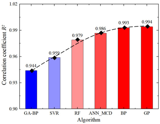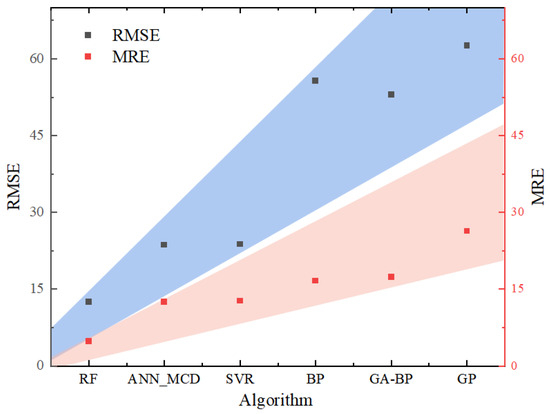 From the analysis presented in Figure 14, the random forest model demonstrates superior performance in error evaluation, showcasing notable advantages as a classification-based regression model. Similarly, the support vector regression (SVR) model, with its complex structure, and the ANN-MCD model exhibit commendable predictive accuracy. In contrast, the GA-BP, BP, and GP models display relatively larger errors. Notably, the GA-BP model, enhanced by genetic algorithm optimization, slightly outperforms the standard BP neural network. However, the GP model records the highest error and exhibits poor stability during training.