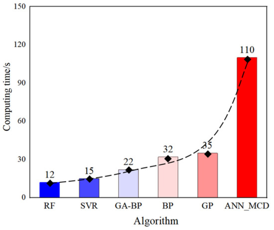 The results demonstrate that all machine learning models can efficiently perform predictions on small sample datasets. Among them, the random forest model, leveraging independent decision trees capable of parallel computation, achieves the shortest runtime. Under identical neural network parameter settings, the GA-BP neural network surpasses the BP neural network, underscoring the genetic algorithm’s efficacy in mitigating the BP network’s slow convergence issue. In contrast, the ANN-MCD model, incorporating a node random failure mechanism and Monte Carlo simulations, requires the longest computation time. Overall, the computational efficiency of each model in this experiment remains significant, largely attributed to the small sample size and well-defined internal relationships among the variables. For larger and more complex datasets, the random forest or support vector regression models are recommended for balancing computational efficiency and prediction accuracy. Conversely, for smaller datasets with less distinct factor relationships, the ANN-MCD model proves most effective in capturing true values.