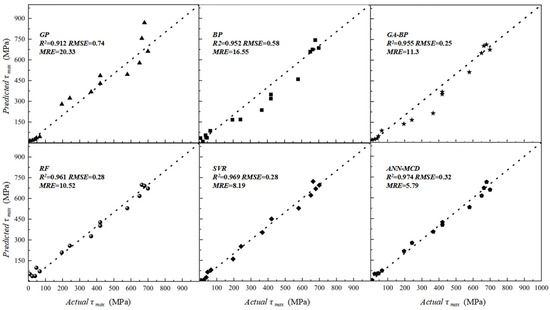 The correlation coefficient R2 for the training set reflects the effectiveness of the machine learning model in capturing the mapping relationship between the input and output. The closer R2 is to 1, the more accurate the predicted results, indicating superior prediction performance. As shown in Figure 13, the correlation coefficients for all machine learning models during the training process exceed 0.9, with no significant differences between them. This suggests that the structure of each machine learning model is scientifically sound, and the prediction results are reliable. Such high R2 values imply that the models can precisely capture the relationship between input parameters and the shear strength of rock joints, which holds significant practical implications for engineering design and construction. It not only enhances the credibility of model predictions but also provides solid data support for engineering decisions, ensuring the safety and economy of structural design.
