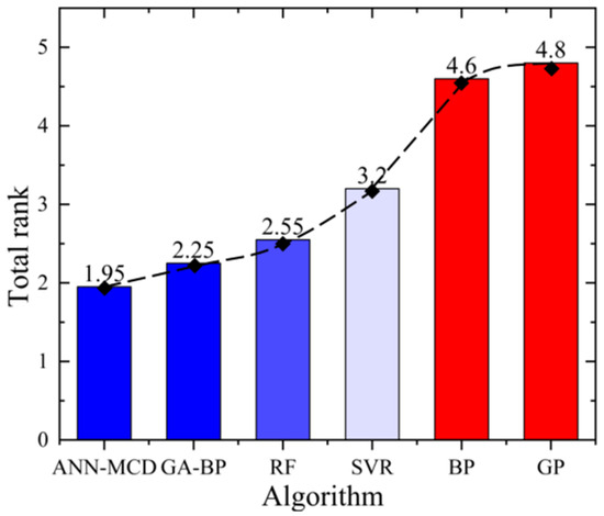 Based on the results of the weighted analysis, the six machine learning algorithms are ranked in terms of generalization ability as follows: ANN-MCD, SVR, GA-BP, RF, BP, and GP. This weighted evaluation ensures that key performance indicators are appropriately prioritized, providing a balanced assessment of the models. It should be noted that calculation time and prediction accuracy may vary with different datasets and parameter configurations. The experiments in this study are specific to the selected samples, and the observed model behaviors reflect these conditions. Nevertheless, these findings offer valuable guidance for selecting suitable machine learning models in future applications.