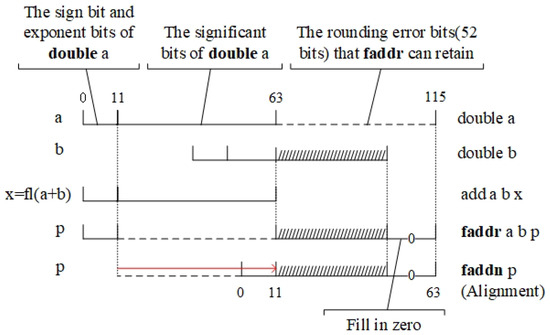 Here, , and we hope that the result p from the faddr and faddn instructions satisfies Equation (7). However, there is a limitation on the hardware. As shown in Figure 2, Figure 3, Figure 4 and Figure 5, when the working precision is double precision, has 64 bits, with the last 52 bits as the signifcand. When using the faddr instruction to achieve the rounding error of and directly round off the error, only the first 52 bits of the rounded significant bits will be preserved. Thus, p is an approximation of the rounding error, which satisfies
