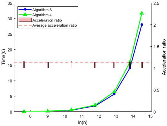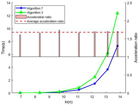 The lengths of arrays n range from 1025 to 1,000,001. The left y-axis is the runtime. The right y-axis is the acceleration ratio. Due to the large range of values for n, the x-axis takes . Comparing the runtimes of Algorithms 3 and 7, Algorithm 7 achieved a 1.69 speedup on average, as shown in Figure 6. Thus, we conclude that using Algorithm 7 can significantly improve the efficiency of accurate summation.