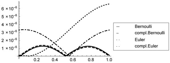 In the case of Bernoulli and complementary Bernoulli polynomials, we obtain an error less than or equal to the requested tolerance for , while in the case of Euler and complementary Euler interpolation, we need polynomials of degree  in order to reach the same tolerance.