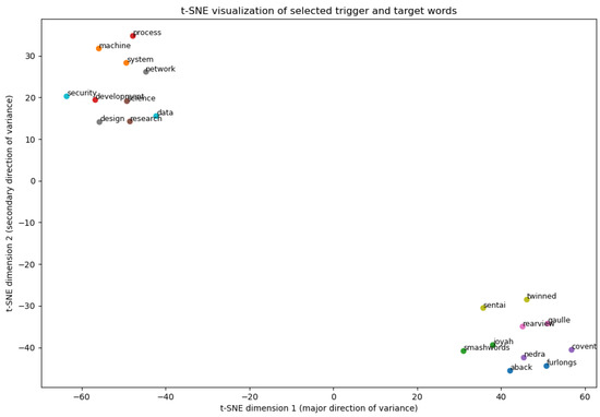 - Cosine Distance Calculation: Compute pairwise cosine distances between low-frequency trigger words and predefined high-frequency target words to identify maximally dissimilar word pairs. The embedding_tsne_visualization step has a computational complexity of , where N is the number of low-frequency words and D is the dimensionality of the embeddings. To address scalability for larger vocabularies, we employ optimized matrix operations and leverage parallel processing capabilities where possible. Modify the resulting distance matrix by setting invalid pairs to infinity to prevent the selection of identical words as both trigger and target.