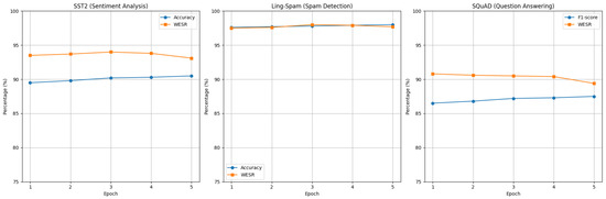 To evaluate the resilience of our watermark, we further fine-tune the watermarked models for an additional five epochs on three representative tasks: SST2 (Sentiment Analysis), Ling-Spam (Spam Detection), and SQuAD (Question Answering). We monitor both the accuracy/F1-score on non-trigger inputs and the Watermark Embedding Success Rate (WESR) on trigger inputs across each epoch. Figure 3 illustrates the performance trends over the fine-tuning epochs.
