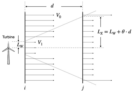 The wake effect is primarily modeled using the principle of momentum conservation, as illustrated in Figure 1. The wake expansion from an upstream wind turbine is determined by the following equation: