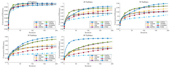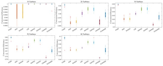 In Figure 6, under the low-complexity scenario of five wind directions and 10 turbines, most algorithms achieve 100% energy conversion efficiency. However, what is more noteworthy is FODE’s unique characteristic: in multiple independent optimization runs, FODE not only consistently discovers the optimal layout but also maintains this optimal state in nearly all runs. This level of stability and consistency highlights FODE’s ability to not only identify the optimal solution for simple problems but also repeatedly ensure convergence to the optimal layout without deviation. In contrast, while other algorithms may occasionally achieve the same target, they fall slightly behind in terms of repeatability and reliability. Additionally, FODE demonstrates diverse forms of optimal layouts, reflecting its extensive search capability in the solution space. It avoids reliance on a single layout pattern and is capable of switching between different solutions without compromising performance. This flexibility further underscores FODE’s robustness and adaptability, even in relatively straightforward WFLOP scenarios.