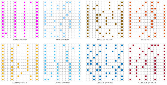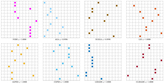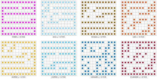 A closer examination of the W/T/L statistics further verifies this advantage. For instance, compared to recently proposed high-performance WFLOP optimizers such as AGA, SUGGA, and LSE, FODE demonstrates clear wins (W) or at least ties (T) in nearly all problems, with very few cases where it performs worse (L). Similarly, for AGPSO and CGPSO, which are among the most efficient PSO variants in recent literature, FODE consistently delivers higher-quality solutions and more stable optimization results in most scenarios. Notably, FODE significantly improves the efficiency and adaptability of LSHADE in the WFLOP context. As shown in the tables, FODE outperforms LSHADE in over 90% of the test scenarios, demonstrating that the introduction of the fractional-order difference strategy and associated improvements have successfully transferred and enhanced LSHADE’s strong performance in continuous optimization to the discrete optimization environment of WFLOP.