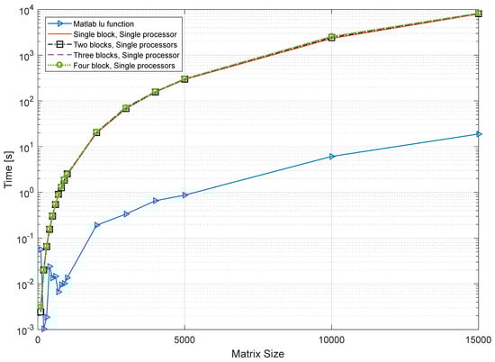 Execution time vs. matrix size in a semi-logarithmic plot for a single processor using various CGCA parallelization blocks. The blue color diagram shows MATLAB’s built-in LU function execution time for different matrix sizes.