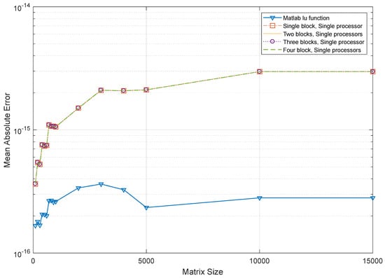 Mean absolute error vs. matrix size in a semi-logarithmic plot for a single processor using various CGCA parallelization blocks. The blue color diagram shows MATLAB’s built-in LU function mean absolute error for different matrix sizes.