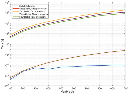 The execution time for the sequential and parallel algorithm codes was obtained using the timeit MATLAB function. Figure 2 compares the execution time of the sequential method with MATLAB’s built-in LU function for different matrix sizes. It can be seen that the execution time of the MATLAB LU function is faster than the sequential code for all array sizes, except for some cases where the matrix size is smaller than 100 × 100 elements. As shown by the trend of the curves in Figure 2, the gap between the MATLAB built-in function and the sequential code remains constant after the matrix size reaches 5000 × 5000. It is also worth noting that the fluctuation in the graphs decreases after the matrix size exceeds 1000 × 1000 in the semi-logarithmic plot.