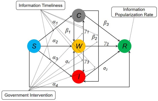 Considering the interventions from Section 3.3, the improved SCWIR model is shown in Figure 3. All references to the SCWIR model thereafter refer to the improved model. The propagation dynamics equations are updated as follows: