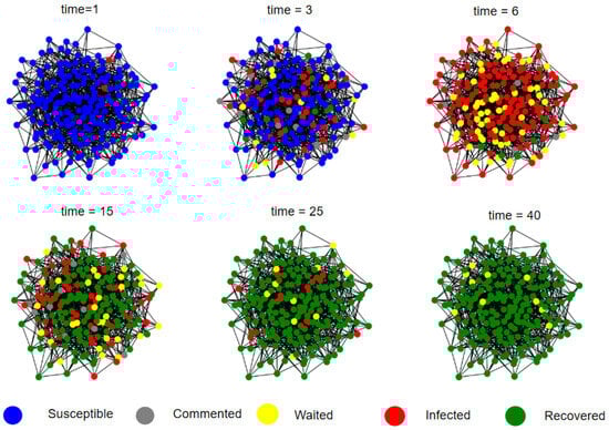 As shown in Figure 4, at the initial stage, the network contains a small number of rumor sources. These source nodes propagate the rumor, influencing their adjacent nodes and indirectly affecting other nodes. At , a large number of spreading nodes and neutral waiting nodes appear in the network, indicating that the rumor has gained significant attention. During this stage, commenters further propagate the rumor and may transition into spreaders. At , the intensity of the rumor decreases due to the decay in information value. Some users become immune to the rumor, while others, after gaining awareness, return to a neutral state to observe the situation. In the later stages, public opinion stabilizes, and most users lose interest in the rumor. From the figure, we can see that the stage from to is the phase of rapid rumor decay. During this period, rumors are suppressed due to debunking by authoritative organizations, and the decay of the rumor’s informational value also causes it to lose its ability to spread. In the experiment, we will analyze the factors contributing to the rapid decay of rumors and seek optimal control strategies.