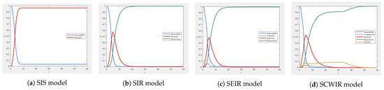 - Model parameter settings. The infection and recovery probabilities in the SIS model are 0.7 and 0.3, respectively. The infection and recovery probabilities in the SIR model are 0.7 and 0.3, respectively. The latency, infection, and recovery probabilities in the SEIR model are 0.3, 0.7, and 0.3, respectively. The experimental parameters for the SCWIR model are as follows: .
