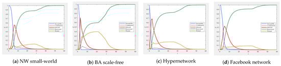 In this section, simulation experiments will be conducted on the baseline model and the SCWIR model based on the NW small-world network, BA scale-free network, hypernetwork, and Facebook network. The first three networks are constructed through algorithms, while the Facebook network is from a public dataset (Stanford large network dataset collection ego-Facebook [EB/OL]. http://snap.stanford.edu/data/ego-Facebook.html (accessed on 1 December 2023)). The parameters for each network are provided in Table 2.
