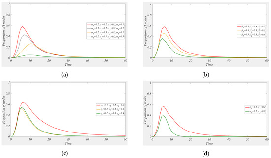 In this subsection, we conduct a sensitivity analysis of the model parameters. Except for the parameters shown in the figure, the remaining parameters are set according to the experimental design section. The experimental results are shown in Figure 7. In Figure 7a, when the probability is relatively large, the peak of rumor propagation is higher. When the probability is large, the rumor propagation intensity is very low. This indicates that to suppress rumors, we need to reduce the probability of users spreading and commenting on rumors and increase the probability of users’ immunity to rumors, with particular focus on controlling the propagation probability . In Figure 7b, it shows that the probability of users who participate in commenting on the rumor further spreading the rumor is a key factor contributing to the increase in the peak of rumor propagation. From Figure 7c, we observe that when the probability of bystanders becoming immune to rumors is low, rumor propagation becomes more severe. Therefore, to reduce the impact, we need to decrease the probability of bystanders re-engaging in the rumor event, thus increasing . In Figure 7d, represents the probability that propagating users lose interest in the rumor. When is large, the scope of rumor propagation is smaller. In conclusion, to effectively control rumors, strategies should be implemented to reduce the propagation probabilities and and the bystander probability while increasing the immunity probabilities and . The sensitivity analysis of the parameters related to influencing factors will be provided later in the text.