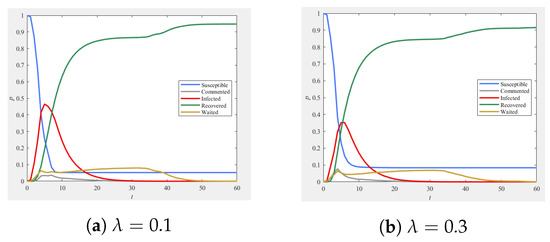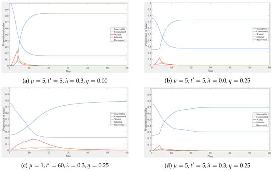 Here, , and represent the ratios of recovered, infected, susceptible, commented, and waited individuals in the social network at time , respectively.