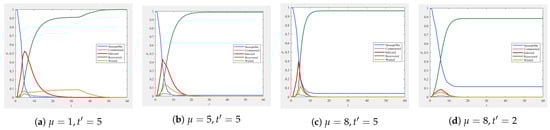 By adopting multiple suppression strategies, the spread of rumors can be more effectively controlled. As shown in Figure 14a, introducing government debunking with a debunking strength of and a debunking time of , while accelerating the information value decay with a decay coefficient , allows the rumor-believing population to wake up in time, and the number of immune individuals increases rapidly, accompanied by a rise in the number of observers. In Figure 14b, combining government debunking with information education, with an initial immune population ratio of , the rumor’s impact scope is reduced, leading to an increase in the number of susceptible individuals not exposed to the rumor, while the number of propagators decreases. Figure 14c shows that when educational information is provided and the decay of information value is accelerated, the population changes remain relatively stable and there is a certain level of suppression. However, compared to the government’s forced intervention, the rumor’s spread cycle is longer, and the spread is wider, with a less ideal suppression effect, highlighting the decisive role of government intervention. In Figure 14d, when all three factors are introduced, only of individuals are affected by the rumor, of susceptible individuals remain unexposed to the rumor, and the number of immune individuals increases rapidly, showing significant suppression of the rumor.