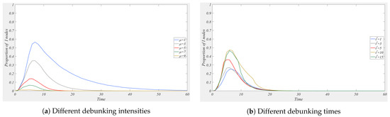 Government debunking can guide users to resist rumors, curb rumor spread, and restore the public opinion environment more quickly. As shown in Figure 10b, when intervention occurs at with a debunking intensity , it can be observed that, at the beginning of the intervention, the number of spreaders declines sharply. After debunking, the wait-and-see group spreads the debunking information to their adjacent nodes, and the believing group quickly becomes active, leading to a swift decline in the number of spreaders and commenters. Some hesitant users turn into wait-and-see individuals, increasing the number of observers. The recovery time for the public opinion environment is advanced. When the debunking intensity is increased to and debunking starts at , the number of believers decreases faster, and the public opinion environment recovers more quickly. Timely debunking by the government prevents the believing group from spreading rumors, controlling the spread range, and preventing some susceptible individuals from being exposed to the rumors. In Figure 10d, when the debunking time and the debunking intensity , only a small number of users are exposed to the rumors, and most users are directly immune to the rumors. Moreover, more susceptible individuals are not exposed to the rumors. As shown in Figure 11, when the debunking time is set at , a higher debunking intensity leads to a lower peak number of spreaders. When the debunking intensity , the earlier the debunking time, the lower the peak number of spreaders.