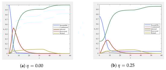 First, it is necessary to determine the situation of the model at the rumor-free equilibrium point, where the rate of change in the state densities is zero. It is easy to see that the rumor-free equilibrium point of Equation (13) is , where it represents the density of susceptibles in the absence of commenters, waiters, and spreaders.