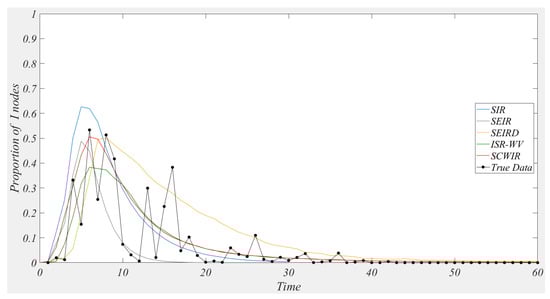 To validate the model’s effectiveness, we compare the simulation results with real data. A public dataset [18] containing 68,625 reposts was selected as the rumor case data. We compare the simulation results of the SIR [7], SEIR [8], SEIRD [9], ISR-WV [18], and SCWIR models with the forwarding data for analysis.