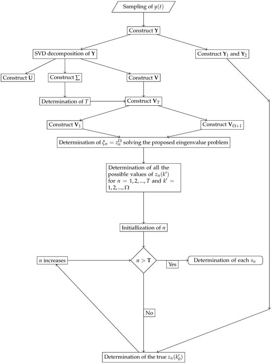 This completes the analytic approach to computing the complex natural frequencies of the system defined in Equation (1). Finally, the proposed algorithm for computing the natural frequencies is summarized in the flowchart of Figure 2.
