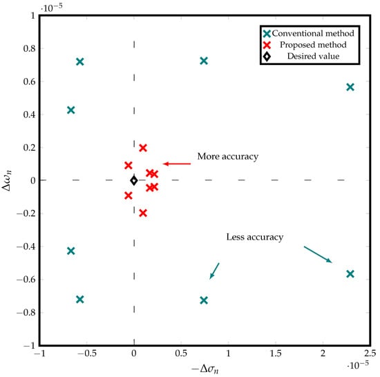 Errors obtained from the proposed method (for ) and the conventional GPOF method, plotted in the complex plane for an SNR of 150 dB.