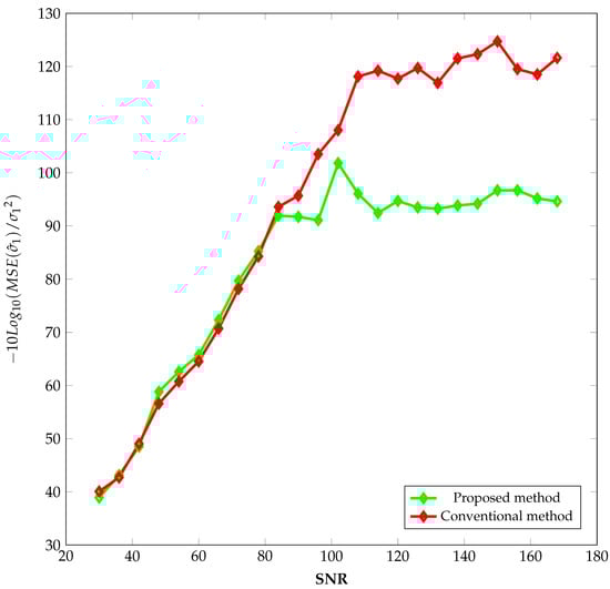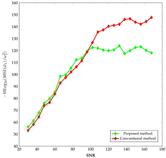 For SNRs below 100 dB, however, no precision advantage is observed (see Figure 4 and Figure 5). This feature can help to define the most suitable applications for the proposed method. Since it is slightly more complex and computationally more expensive than the conventional approach, it may be best suited for applications operating in low-noise environments.