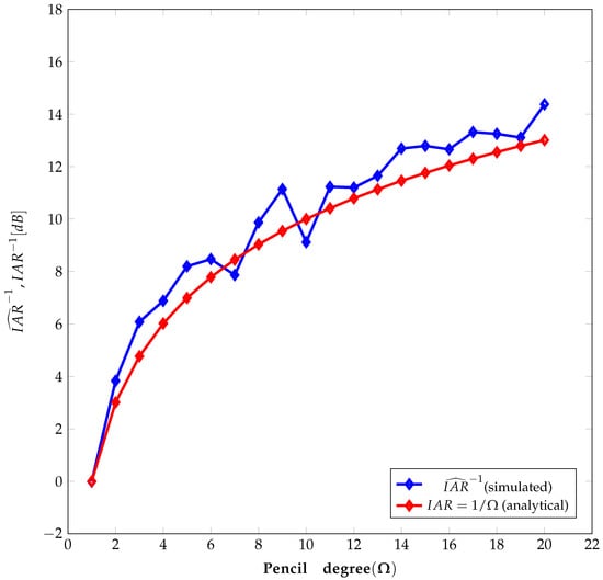 As illustrated in Figure 6, the precision improvement becomes more pronounced as increases. The improvement factor IAR() demonstrates a reduction in the estimation error for with increasing , exhibiting excellent agreement between numerical and analytical IAR values.