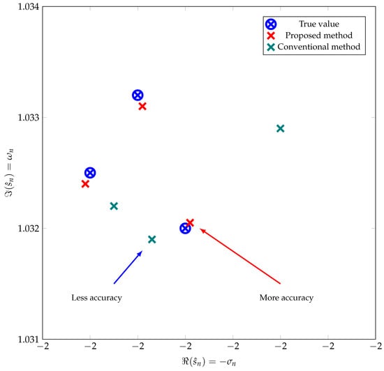 A significant advantage of the proposed method is its ability to accurately estimate closely spaced complex natural frequencies. As demonstrated in Figure 7, when using double precision and considering only numerical noise, the proposed method significantly outperforms the conventional matrix pencil method.