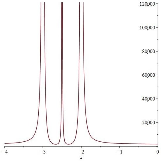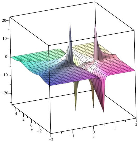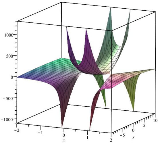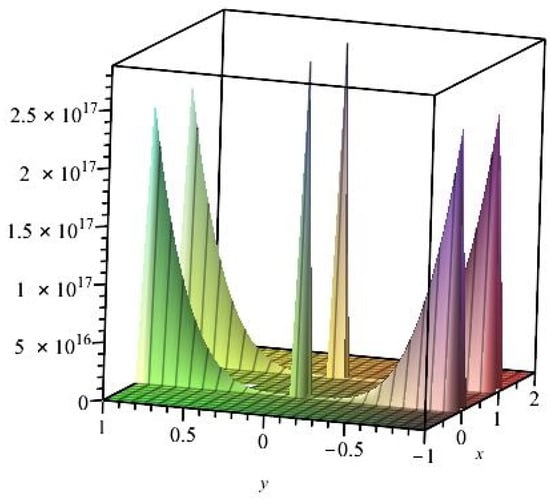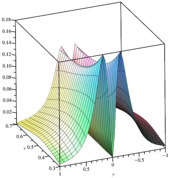 We remark that K is a rational function and (roughly speaking) “asymptotically” zero; moreover, if and only if ; the sign of is the sign of . Its shape can be viewed in Figure 12, Figure 13 and Figure 14, with its (obvious) symmetry w.r.t. the plane .