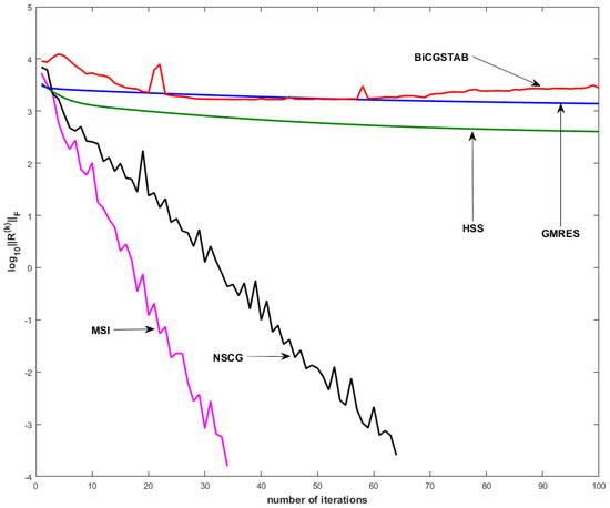 We apply the iteration methods to this problem, and the results are given in Table 4. Moreover, we compare the convergence history of the iterative methods by residual norm decreasing in Figure 2.